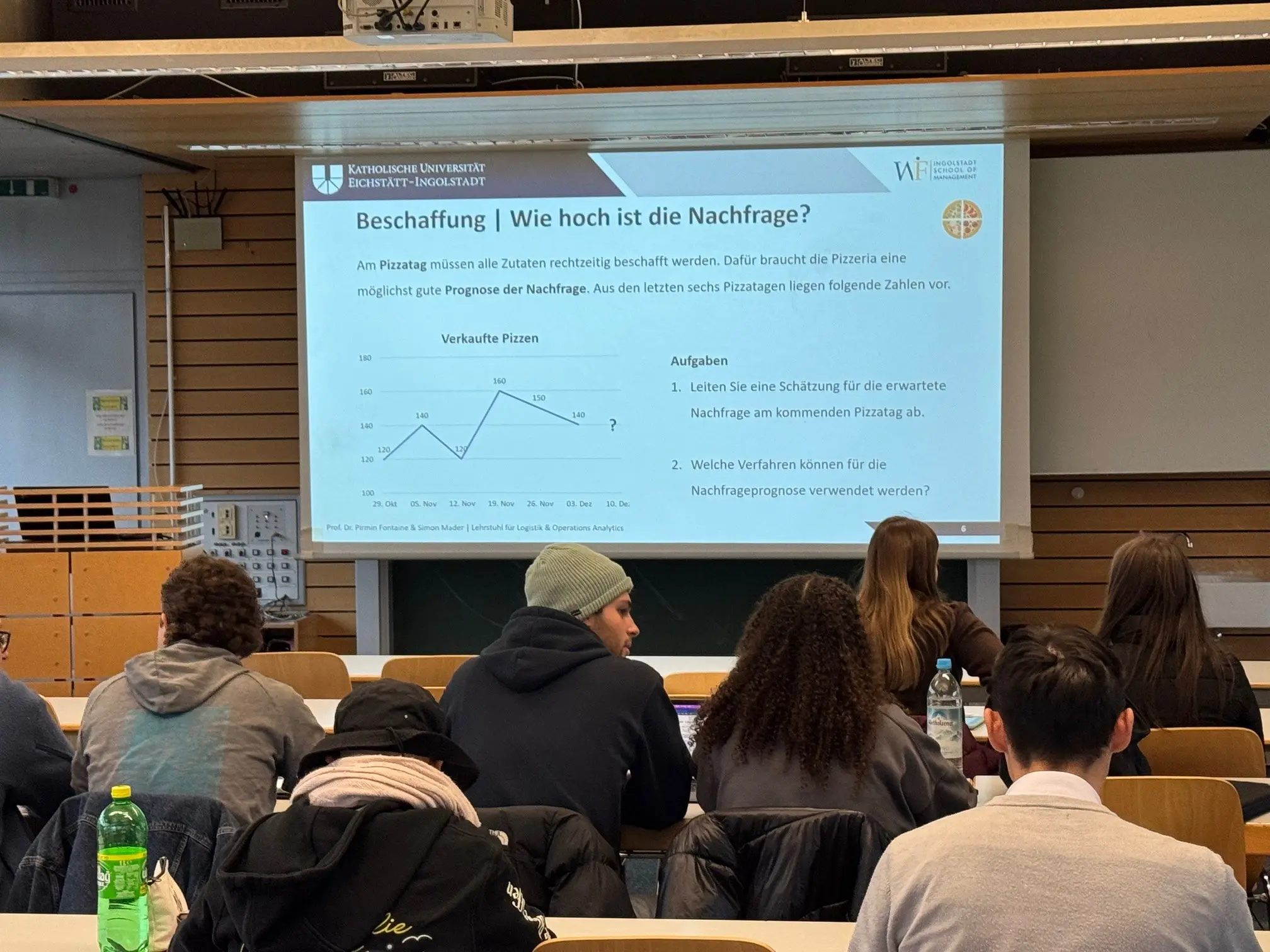 In dieser Woche gaben Prof. Dr. Pirmin Fontaine und Simon Mader einen Einblick in das Gebiet der Logistik. Anhand der praxisnahen Fragestellung der Planung eines gemeinsamen Pizzaabends bearbeiteten die Studierenden Aufgaben aus den Bereichen Beschaffung, Produktion, Distribution und Transport.