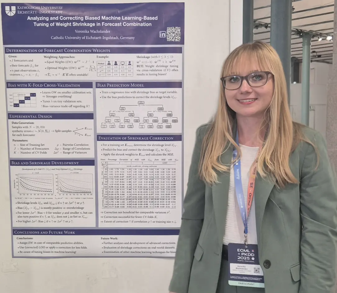 Veronika stellte die wichtigsten Ergebnisse ihres Forschungsartikels “Analyzing and Correcting Biased Machine Learning-Based Tuning of Weight Shrinkage in Forecast Combination” in einem 20-minütigen Vortrag vor und diskutierte die Arbeit ausführlicher in der anschließenden Poster-Session.
