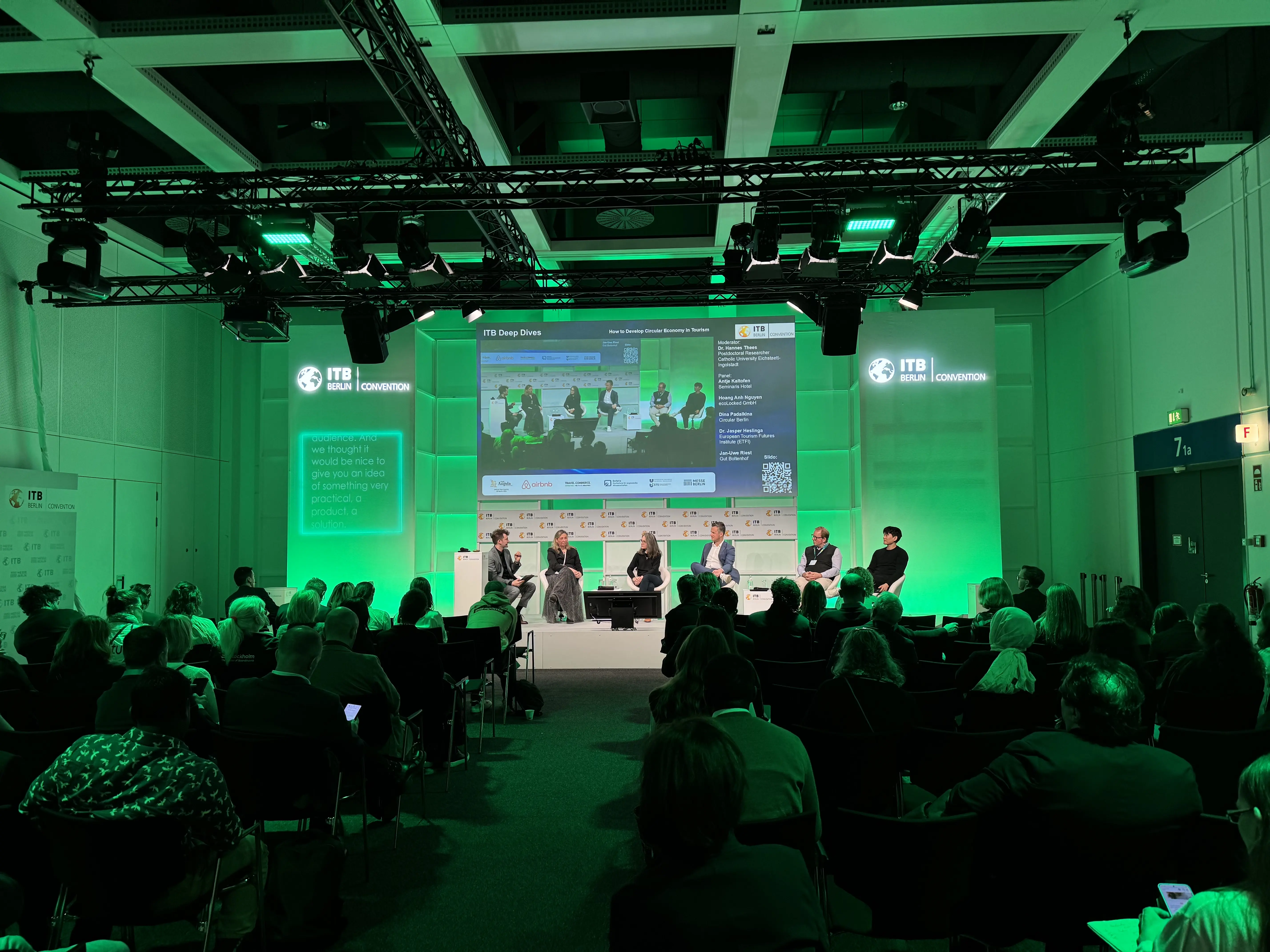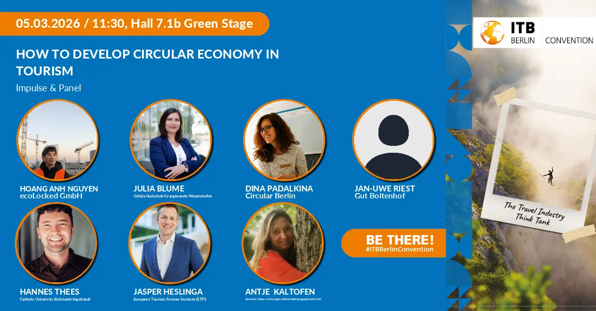Der Lehrstuhl Tourismus hat die Diskussion zur Circular Economy in einem ITB-Deep Dive aktiv mitgestaltet. Moderiert wurde die Session von Hannes Thees, mit Gästen von ecoLocked, Seminaris Hotels, European Tourism Futures Institute (ETFI) / NHL Stenden University, Gut Boltenhof und Circular Berlin.