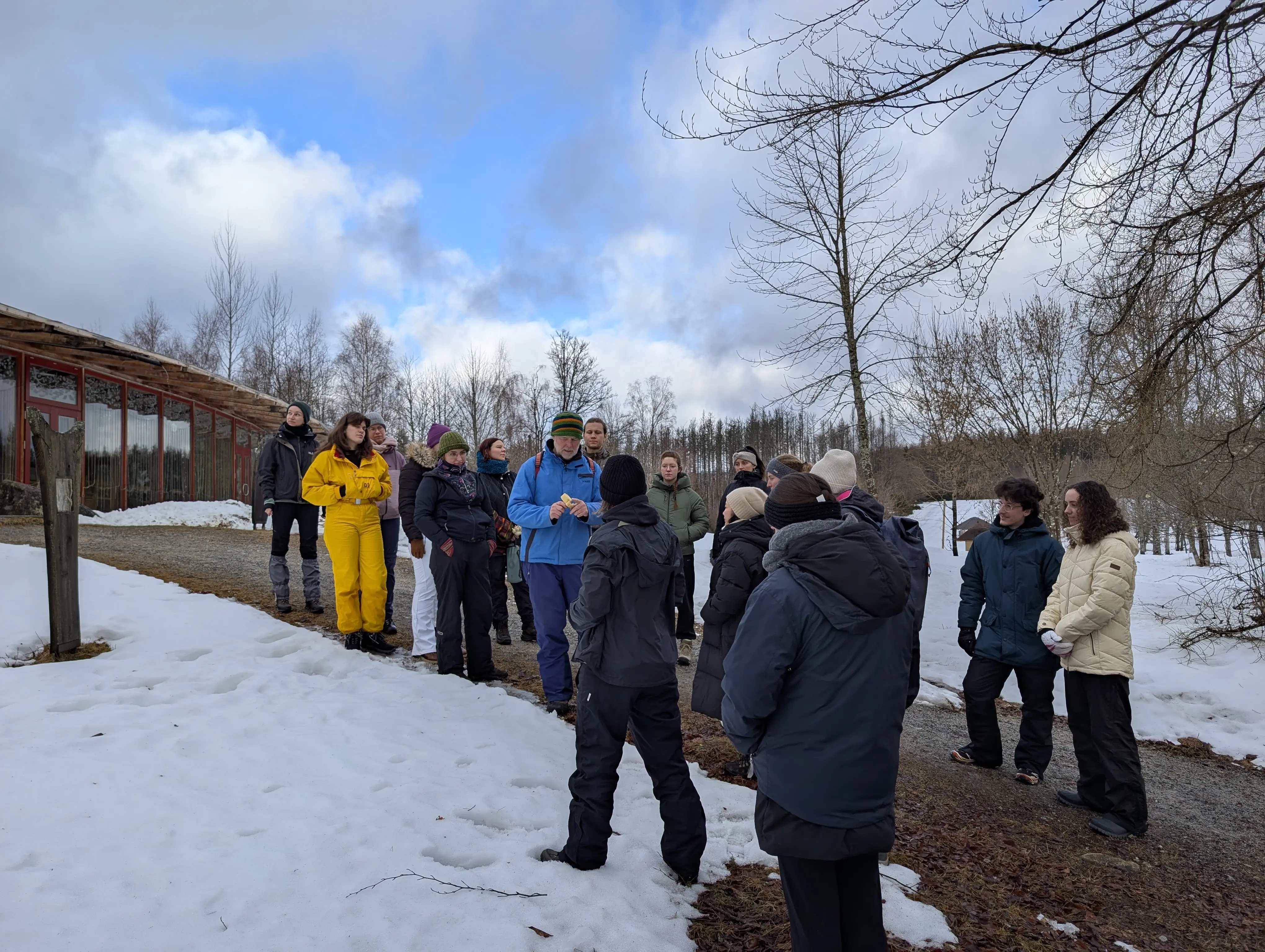 Im Mittelpunkt der Exkursion standen Einblicke in die Bildungsarbeit des Nationalparks sowie praktische Erfahrungen mit verschiedenen Methoden der Bildung für nachhaltige Entwicklung (BNE). Bei einer Wildniswanderung mit dem Umweltbildungsreferenten Lukas Laux erkundete die Gruppe den winterlichen Bayerischen Wald. Dabei lernten die Studierenden Tierspuren im Schnee zu lesen und ihre Aufmerksamkeit auf kleine Details in der Natur zu richten. Zusätzlich setzten sie sich unter anderem mit der Frage auseinander, ob es in der vom Menschen geprägten Welt überhaupt noch „echte“ Wildnis geben kann. Das Leben im Wildniscamp selbst bot besondere Erfahrungen: Übernachtet wurde in einfachen Hütten ohne Strom, elektrisches Licht oder Heizung. Lediglich ein Holzofen sorgte für eine Grundwärme in den Hütten. Bei einem Workshop zum „Nature Journaling“ mit der Waldführerin Ella Krapf hielten die Studierenden ihre Naturbeobachtungen durch Zeichnungen, Notizen und kurze Reflexionsphasen fest. Den Abschluss der Exkursion bildete eine Wanderung zum Haus zur Wildnis mit einer anschließenden Führung durch die Ausstellung und einem Besuch des Wildtiergeheges.